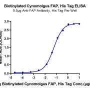 Immobilized Anti-FAP Antibody, hFc Tag at 5ug/ml (100ul/well) on the plate. Dose response curve for Biotinylated Cynomolgus FAP, His Tag with the EC50 of 58.5ng/ml determined by ELISA. See testing image for detail.