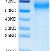 The protein has a predicted MW of 28.2 kDa. Due to glycosylation, the protein migrates to 50-70 kDa based on Tris-Bis PAGE result.