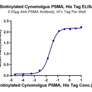 Immobilized Anti-PSMA Antibody, hFc Tag at 0.5ug/ml (100ul/Well) on the plate. Dose response curve for Biotinylated Cynomolgus PSMA, His Tag with the EC50 of 21.2ng/ml determined by ELISA. See testing image for detail.