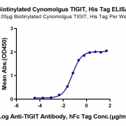 Recombinant Biotinylated Cynomolgus TIGIT Protein is expressed from HEK293 with His tag and Avi tag at the C-terminal.It contains Met89-Ile208.