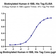 Immobilized Human 4-1BB Ligand Trimer, hFc Tag at 0.5ug/ml (100ul/well) on the plate. Dose response curve for Biotinylated Human 4-1BB, His Tag with the EC50 of 0.58ug/ml determined by ELISA. See testing image for detail.