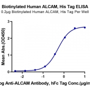 Immobilized Biotinylated Human ALCAM, His Tag at 2ug/ml (100ul/Well) on the plate. Dose response curve for Anti-ALCAM Antibody, hFc Tag with the EC50 of 0.48ug/ml determined by ELISA. See testing image for detail.