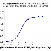 Immobilized Human ICOS (C136S,C137S) , His Tag at 1ug/ml (100ul/Well) on the plate. Dose response curve for Biotinylated Human B7-H2, His Tag with the EC50 of 23.9ng/ml determined by ELISA. See testing image for detail.