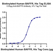 Immobilized Anti-BAFFR Antibody, hFc Tag at 0.5ug/ml (100ul/well) on the plate. Dose response curve for Biotinylated Human BAFFR, His Tag with the EC50 of 5.5ng/ml determined by ELISA. See testing image for detail.