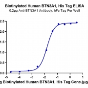 Immobilized Anti-BTN3A1 Antibody, hFc Tag at 2ug/ml (100ul/well) on the plate. Dose response curve for Biotinylated Human BTN3A1, His Tag with the EC50 of 15.4ng/ml determined by ELISA. See testing image for detail.