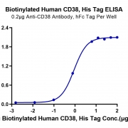 Immobilized Anti-CD38 Antibody, hFc Tag at 2ug/ml (100ul/Well) on the plate. Dose response curve for Biotinylated Human CD38, His Tag with the EC50 of 0.9ug/ml determined by ELISA. See testing image for detail.
