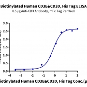 Immobilized Anti-CD3 Antibody, mFc Tag at 5ug/ml (100ul/well) on the plate. Dose response curve for Biotinylated Human CD3E&CD3D, His Tag with the EC50 of 0.72ug/ml determined by ELISA. See testing image for detail.