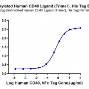 Immobilized Biotinylated Human CD40 Ligand Trimer, His Tag at 2ug/ml (100ul/well) on the streptavidin precoated plate (5ug/ml). Dose response curve for Human CD40, hFc Tag with the EC50 of 0.61ug/ml determined by ELISA. See testing image for detail.