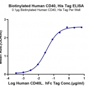 Immobilized Biotinylated Human CD40, His Tag at 1ug/ml (100ul/Well) on the plate. Dose response curve for Human CD40L, hFc Tag with the EC50 of 33ng/ml determined by ELISA. See testing image for detail.