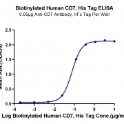 Immobilized Anti-CD7 Antibody, hFc Tag at 0.5ug/ml (100ul/well) on the plate. Dose response curve for Biotinylated Human CD7, His Tag with the EC50 of 76.7ng/ml determined by ELISA. See testing image for detail.