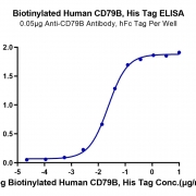 Immobilized Anti-CD79B Antibody, hFc Tag at 0.5ug/ml (100ul/well) on the plate. Dose response curve for Biotinylated Human CD79B, His Tag with the EC50 of 23.3ng/ml determined by ELISA. See testing image for detail.