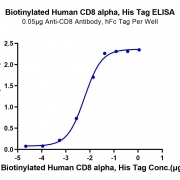 Immobilized Anti-CD8 Antibody, hFc Tag at 0.5ug/ml (100ul/well) on the plate. Dose response curve for Biotinylated Human CD8 alpha, His Tag with the EC50 of 6.0ng/ml determined by ELISA. See testing image for detail.