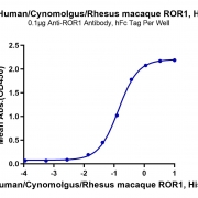 Immobilized Anti-ROR1 Antibody, hFc Tag at 1ug/ml (100ul/well) on the plate. Dose response curve for Biotinylated Human/Cynomolgus/Rhesus macaque ROR1, His Tag with the EC50 of 0.14ug/ml determined by ELISA. See testing image for detail.