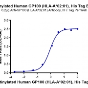 Immobilized Anti-GP100 (HLA-A*02:01) Antibody, hFc Tag at 2ug/ml (100ul/Well) on the plate. Dose response curve for Biotinylated Human GP100 (HLA-A*02:01) , His Tag with the EC50 of 0.88ug/ml determined by ELISA (QC Test). See testing image for detail.