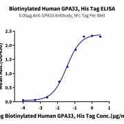 Immobilized Anti-GPA33 Antibody, hFc Tag at 0.5ug/ml (100ul/well) on the plate. Dose response curve for Biotinylated Human GPA33, His Tag with the EC50 of 33.2ng/ml determined by ELISA. See testing image for detail.