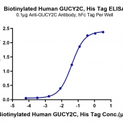 Immobilized Anti-GUCY2C Antibody at 1ug/ml (100ul/well) on the plate. Dose response curve for Biotinylated Human GUCY2C, His Tag with the EC50 of 40.9ng/ml determined by ELISA. See testing image for detail.