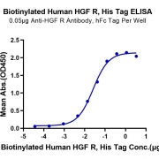 Immobilized Anti-HGF R Antibody, hFc Tag at 0.5ug/ml (100ul/Well) on the plate. Dose response curve for Biotinylated Human HGF R, His Tag with the EC50 of 25.7ng/ml determined by ELISA. See testing image for detail.