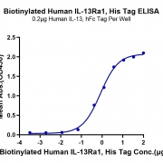 Immobilized Human IL-13, hFc Tag at 2ug/ml (100ul/well) on the plate. Dose response curve for Biotinylated Human IL-13Ra1, His Tag with the EC50 of 0.83ug/ml determined by ELISA. See testing image for detail.