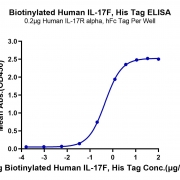 Immobilized Human IL-17 R alpha, hFc Tag at 2ug/ml (100ul/well) on the plate. Dose response curve for Biotinylated Human IL-17F, His Tag with the EC50 of 0.46ug/ml determined by ELISA. See testing image for detail.