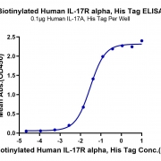 Immobilized Human IL-17A, His Tag at 1ug/ml (100ul/well) on the plate. Dose response curve for Biotinylated Human IL-17R alpha, His Tag with the EC50 of 29.9ng/ml determined by ELISA. See testing image for detail.