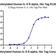 Immobilized Human IL-5, His Tag at 0.5ug/ml (100ul/well) on the plate. Dose response curve for Biotinylated Human IL-5 R alpha, His Tag with the EC50 of 0.12ug/ml determined by ELISA. See testing image for detail.
