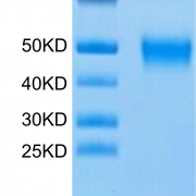 The protein has a predicted MW of 26.3 kDa. Due to glycosylation, the protein migrates to 45-52 kDa based on Tris-Bis PAGE result.
