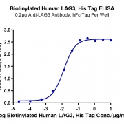 Immobilized Anti-LAG3 Antibody, hFc Tag at 2ug/ml (100ul/well) on the plate. Dose response curve for Biotinylated Human LAG3, His Tag with the EC50 of 12.7ng/ml determined by ELISA. See testing image for detail.