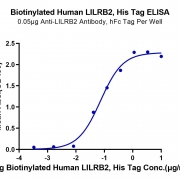 Immobilized Anti-LILRB2 Antibody, hFc Tag at 0.5ug/ml (100ul/well) on the plate. Dose response curve for Biotinylated Human LILRB2, His Tag with the EC50 of 72.6ng/ml determined by ELISA. See testing image for detail.