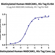 Immobilized Anti-MADCAM1 Antibody, hFc Tag at 1ug/ml (100ul/well) on the plate. Dose response curve for Biotinylated Human MADCAM1, His Tag with the EC50 of 7.5ng/ml determined by ELISA. See testing image for detail.