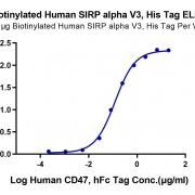 Immobilized Biotinylated Human SIRP alpha V3, His Tag at 1ug/ml (100ul/Well) on the plate. Dose response curve for Human CD47, hFc Tag with the EC50 of 0.12ug/ml determined by ELISA. See testing image for detail.