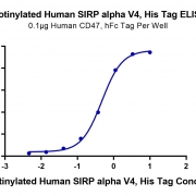 Immobilized Human CD47, hFc Tag at 1ug/ml (100ul/Well) on the plate. Dose response curve for Biotinylated Human SIRP alpha V4, His Tag with the EC50 of 0.47ug/ml determined by ELISA. See testing image for detail.