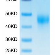 The protein has a predicted MW of 32.1 kDa. Due to glycosylation, the protein migrates to 40-50 kDa based on Tris-Bis PAGE result.