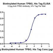 Immobilized Anti-TPBG Antibody, hFc Tag at 2ug/ml (100ul/well) on the plate. Dose response curve for Biotinylated Human TPBG, His Tag with the EC50 of 43.3ng/ml determined by ELISA. See testing image for detail.