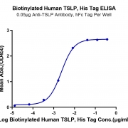 Immobilized Anti-TSLP Antibody, hFc Tag at 0.5ug/ml (100ul/well) on the plate. Dose response curve for Biotinylated Human TSLP, His Tag with the EC50 of 2.3ng/ml determined by ELISA. See testing image for detail.