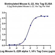 Immobilized Biotinylated Mouse IL-22, His Tag at 2ug/ml (100ul/well) on the streptavidin precoated plate (5ug/ml). Dose response curve for Mouse IL-22R alpha 1, hFc Tag with the EC50 of 6.2ng/ml determined by ELISA. See testing image for detail.