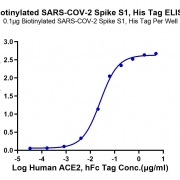 Immobilized Biotinylated SARS-COV-2 Spike S1, Hisi Tag at 1ug/ml (100ul/well) on the streptavidin precoated plate (5ug/ml). Dose response curve for Human ACE2, hFc Tag with the EC50 of 25.5ng/ml determined by ELISA. See testing image for detail.