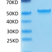 The protein has a predicted MW of 48.9 kDa. The protein migrates to 50-52 kDa based on Tris-Bis PAGE result.