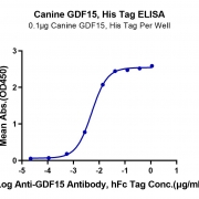 Immobilized Canine GDF15, His Tag at 1ug/ml (100ul/Well) on the plate. Dose response curve for Anti-GDF15 Antibody, hFc Tag with the EC50 of 5.1ng/ml determined by ELISA (QC Test). See testing image for detail.