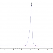 The protein has a predicted MW of 47.6 kDa. Due to glycosylation, the protein migrates to 75-80 kDa based on Tris-Bis PAGE result.