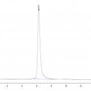 The protein has a predicted MW of 52.2 kDa. Due to glycosylation, the protein migrates to 65-68 kDa based on Tris-Bis PAGE result.