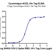 Immobilized Cynomolgus ACE2, His Tag at 5ug/ml (100ul/well) on the plate. Dose response curve for SARS-COV-2 Spike RBD, hFc Tag with the EC50 of 8.9ng/ml determined by ELISA. See testing image for detail.