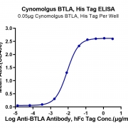 Immobilized Cynomolgus BTLA, His Tag at 0.5ug/ml (100ul/well) on the plate. Dose response curve for Anti-BTLA Antibody, hFc Tag with the EC50 of 8.6ng/ml determined by ELISA. See testing image for detail.