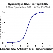 Immobilized Cynomolgus CA9, His Tag at 0.5ug/ml (100ul/Well) on the plate. Dose response curve for Anti-CA9 Antibody, hFc Tag with the EC50 of 10.1ng/ml determined by ELISA. See testing image for detail.
