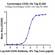 Immobilized Cynomolgus CD30, His Tag at 0.5ug/ml (100ul/Well) on the plate. Dose response curve for Anti-CD30 Antibody, hFc Tag with the EC50 of 7.2ng/ml determined by ELISA. See testing image for detail.