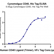 Immobilized Cynomolgus CD40, His Tag at 0.5ug/ml (100ul/Well) on the plate. Dose response curve for Human CD40 Ligand (Trimer) , hFc Tag with the EC50 of 72.0ng/ml determined by ELISA. See testing image for detail.
