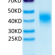 The protein has a predicted MW of 24.6 kDa. Due to glycosylation, the protein migrates to 38-50 kDa based on Tris-Bis PAGE result.