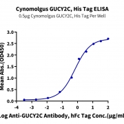 Immobilized Cynomolgus GUCY2C, His Tag at 5ug/ml (100ul/Well) on the plate. Dose response curve for Anti-GUCY2C Antibody, hFc Tag with the EC50 of 0.68ug/ml determined by ELISA. See testing image for detail.