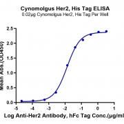 Immobilized Cynomolgus Her2, His Tag at 0.2ug/ml (100ul/Well) on the plate. Dose response curve for Anti-Her2 Antibody, hFc Tag with the EC50 of 13.3ng/ml determined by ELISA. See testing image for detail.