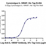 Immobilized Cynomolgus IL-18RAP, His Tag at 0.2ug/ml (100ul/well) on the plate. Dose response curve for Anti-IL-18RAP Antibody, hFc Tag with the EC50 of 6.2ng/ml determined by ELISA. See testing image for detail.