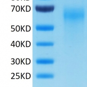 The protein has a predicted MW of 28.2 kDa. Due to glycosylation, the protein migrates to 50-68 kDa based on Tris-Bis PAGE result.